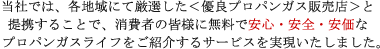 スーパー、ガソリンスタンド、携帯電話会社、プロバイダーなどと同じようにプロパンガスの供給業者はお客様が選ぶと言う時代です。プロパンガスと言う同品質な物であればこそ出費は低いに越した事はありません。毎日必ず使う物です。まずはご家庭・職場で使用されているプロパンガスの保安面、料金面の現状を十分に把握され、お客様のライフスタイル・ビジネススイルに合ったプロパンガス供給会社を選択される事を当社は強くご提案致します。